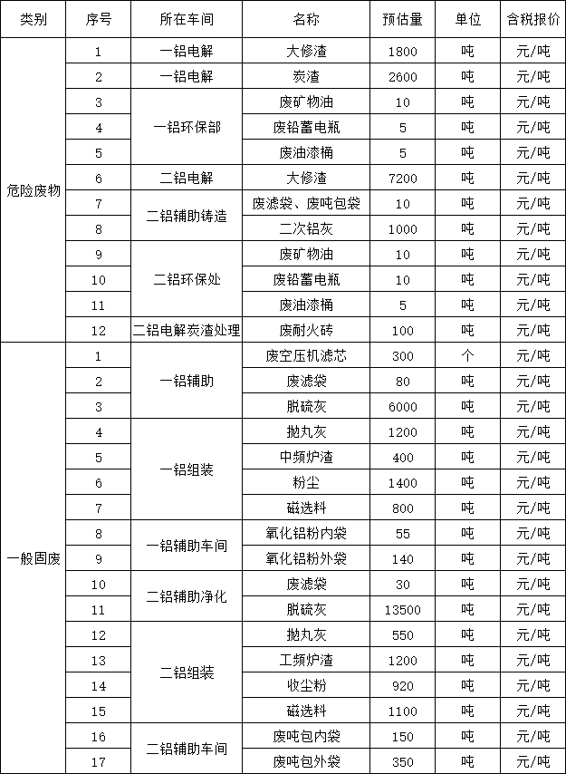 萬基控股集團招標辦近期將對河南萬基鋁業(yè)股份有限公司的危廢(十二項);大修渣、二次鋁灰、炭渣等;一般固廢(十七項);噸包袋、中頻爐渣、磁選料等物料進行銷售招標(下附清單),業(yè)主單位不對該物資的質量、用途等做任何承諾,以現(xiàn)場標的物現(xiàn)狀為準。歡迎參與前期實物勘查。